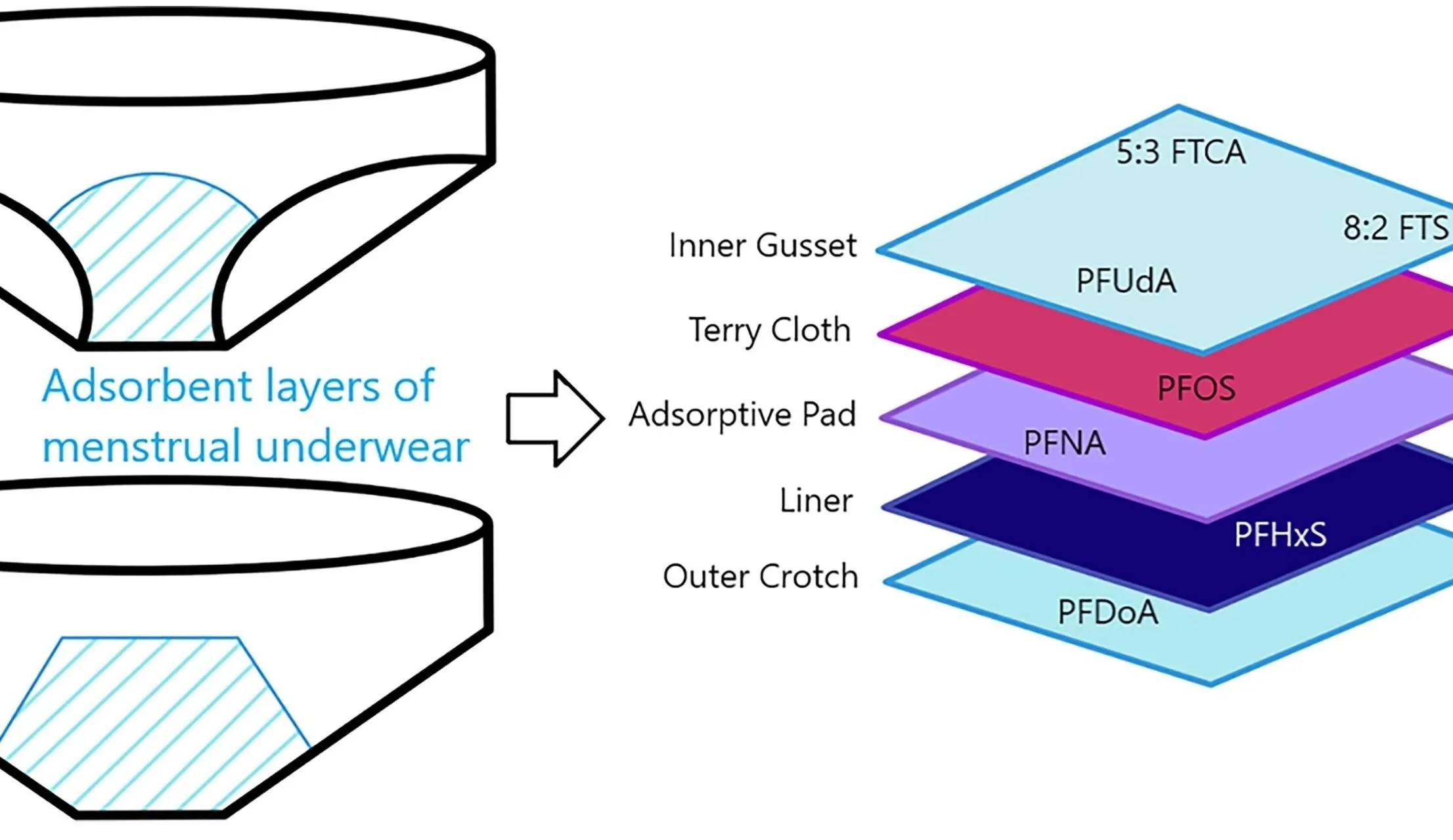 Menstrual underwear are reusable, leak-resistant menstrual hygiene products. We analyzed PFAS in extracts of underwear garments and detected twenty PFAS in at least one layer of a garment. All garment layers contained at least one target PFAS. Outer crotch layers, which contact the epidermis, exhibited the highest total PFAS concentrations. Both short- and long-chain PFAS of various subclasses were among the layers, with fluorotelomers detected most frequently. These findings indicate that menstrual underwear may be a source of monomeric PFAS exposure.