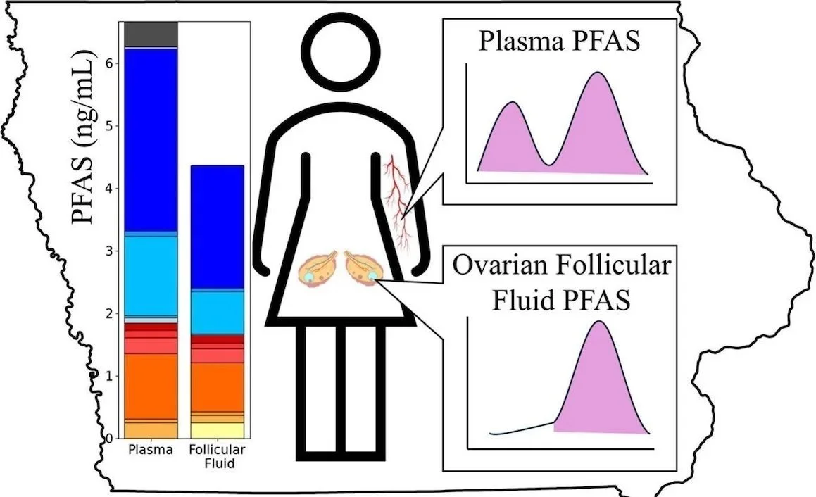 PFAS migrate from women’s blood and into the ovarian follicular fluid that surrounds developing oocytes. We established which of these toxic PFAS move into the follicular fluid and how abundant they can become when there. We found that PFAS with carboxylic acid head groups and branching structures are less likely to appear in follicular fluid than otherwise identical PFAS with straight chains. These findings imply that subtle changes in structure can have large impacts on PFAS movement through the body.